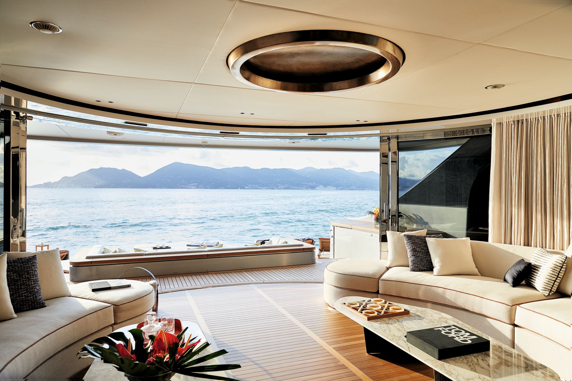 of the yacht creating an open-airlounge on the sea without limits. From the main lounge over to the steps leading down into the water, the flow is unbroken and the view of the horizon unimpeded.