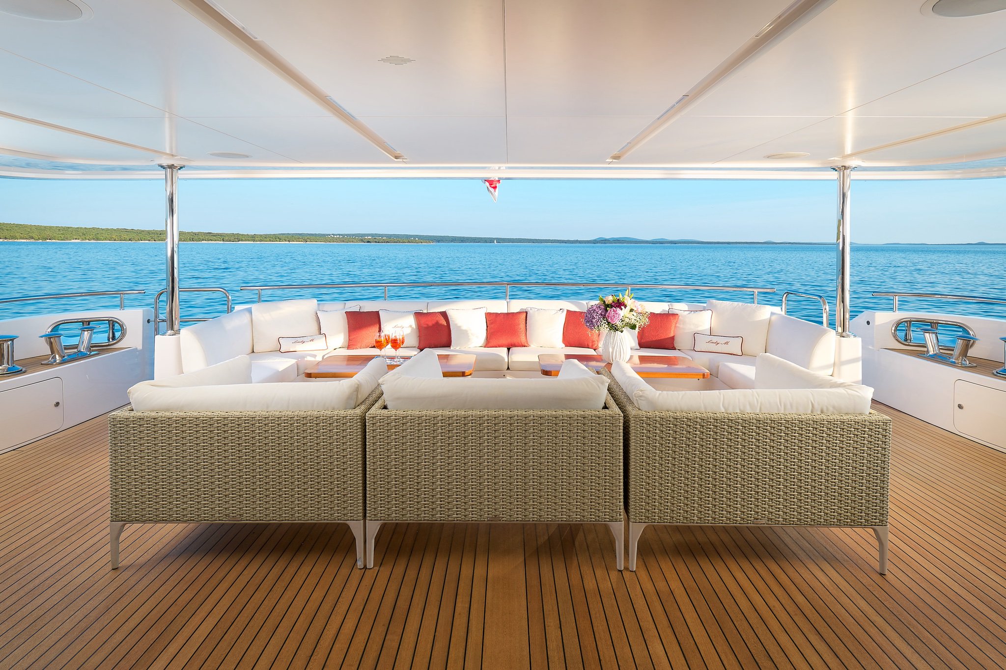 Outdoors, she has a spacious 110 square metre sundeck that includes a large zone towards the stern with settees and lounge chairs, while the Jacuzzi is situated further forward. The same deck hosts a television screen and full bar for guest entertainment.