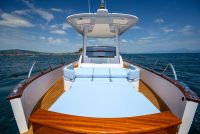 The innovative Gozzo di casa Mimì was born to meet the needs of those who want to exploit the boat at 360° even in the forward area and not only when you are stopped at mooring. In fact, you can reach the sofa in the bow even sailing at 30 knots, where you can find the two opposite sofas that turn into sundecks or thanks to the table, you can use it for an aperitif. Same thing at the stern where the 5-seater sofa with fold-down backrest makes the sundeck always available. In the cockpit you can move around freely without the need for a path.