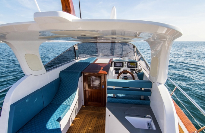 This beautiful and charming gozzo is the first of the series with an HT (hardtop) and its innovative design does not go unnoticed. The strength of Libeccio 11 is the internal division of the hull. In fact, it has 2 separate cabins, a double cabin and another one in the dinette, which, thanks to a retractable bulkhead system, becomes a second double bedroom.