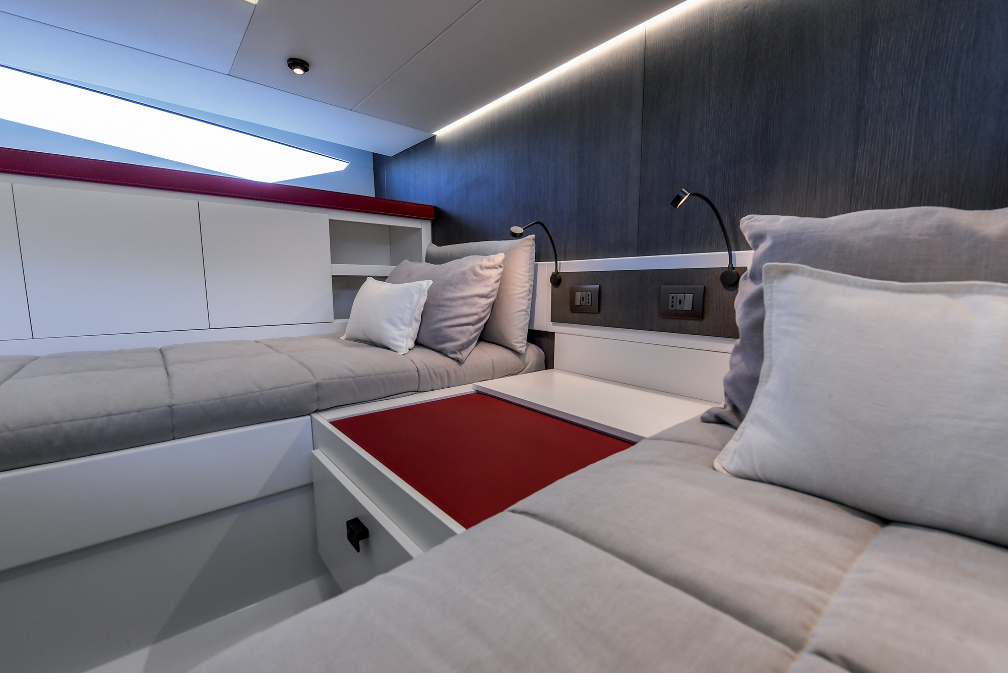 Height makes this motor-yacht an absolute one of a kind. With its 1.80 m, the aft cabin has got a good 30 cm on any other motorboat in this size category. If you desire to have some privacy up here, you can close the bulkheads. The standard interior layout includes a cabinet with a boudoir and a full-height wardrobe.