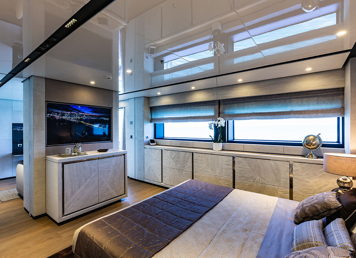 One of the most exceptional features on board can be found in the area reserved for the owner: an apartment that extends across the complete beam of the yacht with two private balconies overlooking the sea.